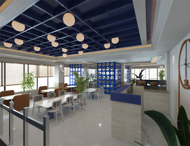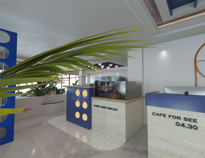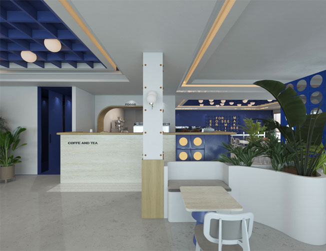 در طراحی داخلی کافه ۴C، رنگ آبی به عنوان تم اصلی انتخاب شده و با ترکیب آینهها و هندسهی دایرهای، فضایی پویا، معاصر و شفاف ایجاد گردیده است.