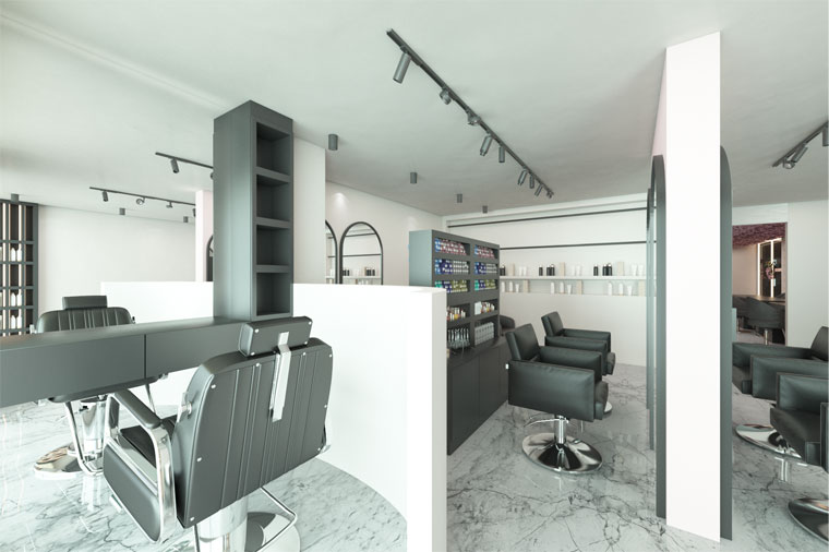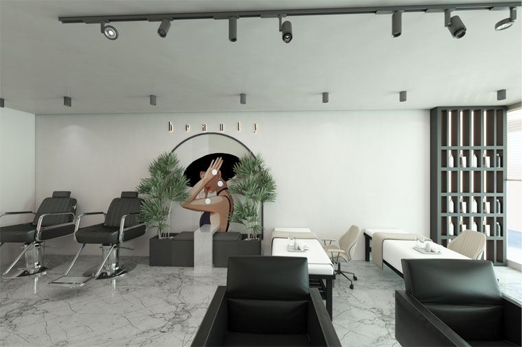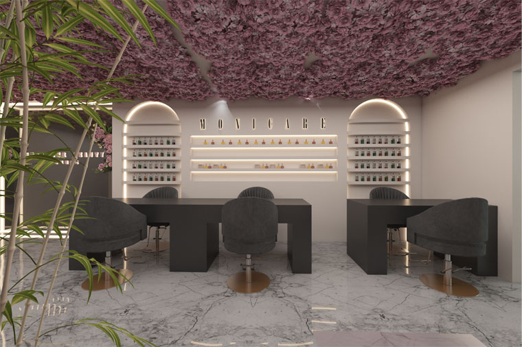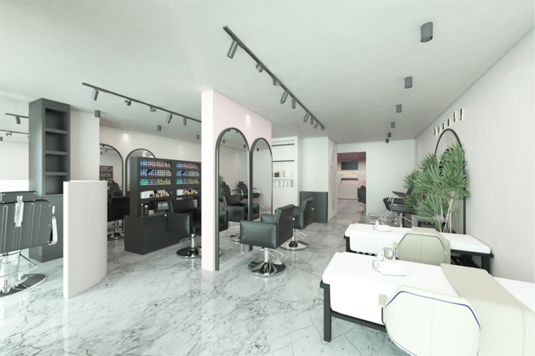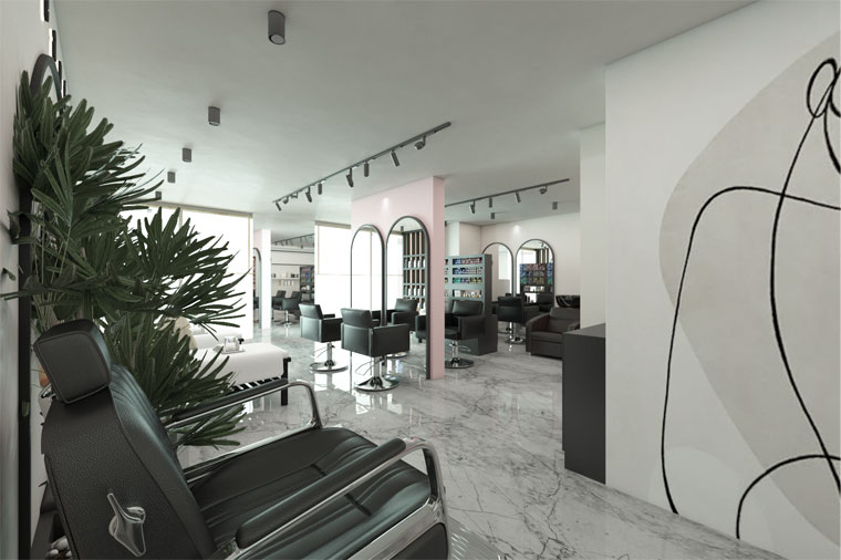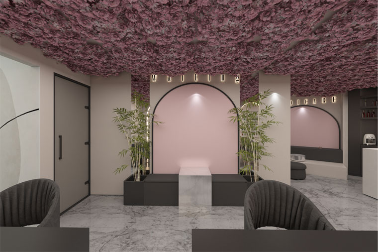 ویژگیهای طراحی در بخشهای مختلف فضا بهطور هوشمندانه اجرا شده است: - ورودی: دیوار ساده با لوگوی طلایی-مشکی و شاخههای گل صورتی برای خوشامدگویی. - سالن انتظار: مبلمان مینیمال، خطوط ساده و یک گلدان بزرگ صورتی بهعنوان نقطهی کانونی. - فضای خدمات: ردیفی از آینههای فریم مشکی، نورپردازی دقیق از بالا و کنارهها، و صندلیهای ساده در رنگهای خنثی. - جزئیات: تضاد میان سیاهی قابها، سفیدی دیوارها و لطافت رنگ صورتی، هویت اصلی طراحی را میسازد.