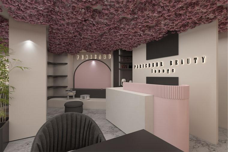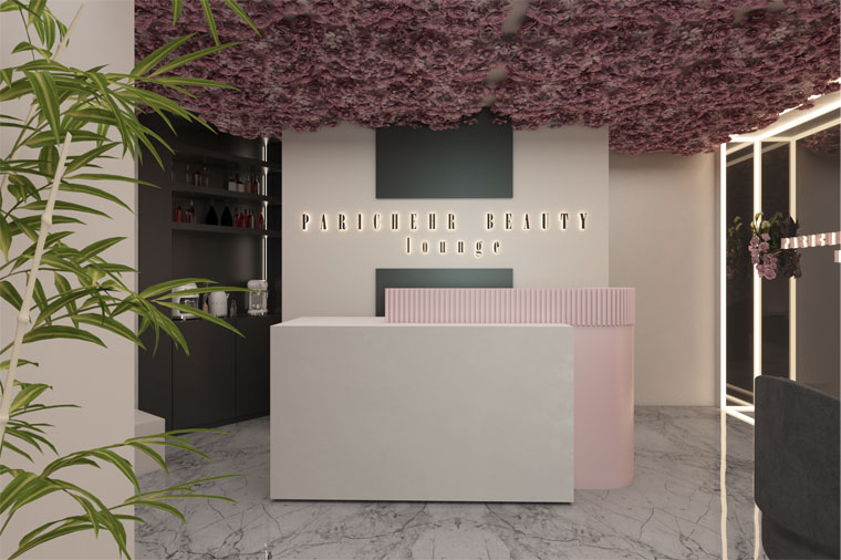 کانسپت فضایی سالن پریچهر بر پایهی سادگی و تضاد رنگی شکل گرفته است. دیوارهای سفید مینیمال بهعنوان بومی خالی عمل میکنند تا رنگها، نور و المانهای گل صورتی برجسته شوند. حضور آینههای فریم مشکی با خطوط مدرن و استوار، تضادی چشمنواز با لطافت صورتی ایجاد کرده و فضایی مدرن و شاعرانه پدید میآورد. نورپردازی استاندارد با CRI بالا و دمای نزدیک به نور روز، دقت نمایش رنگها را تضمین کرده و به عملکرد حرفهای پرسنل کمک میکند.